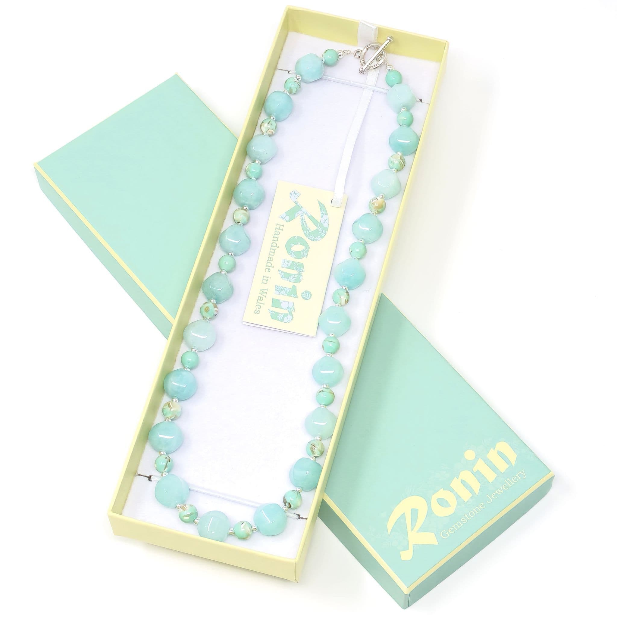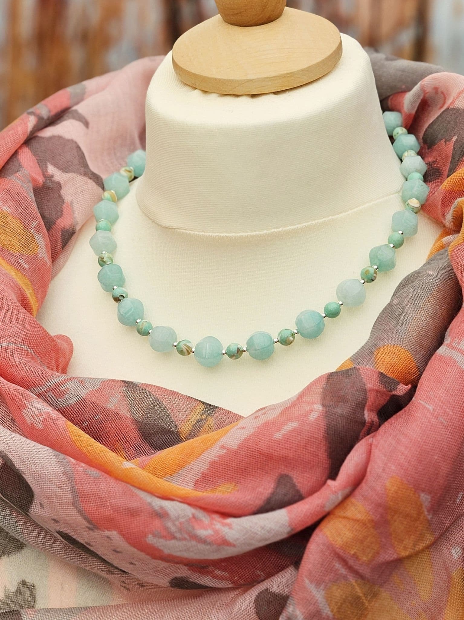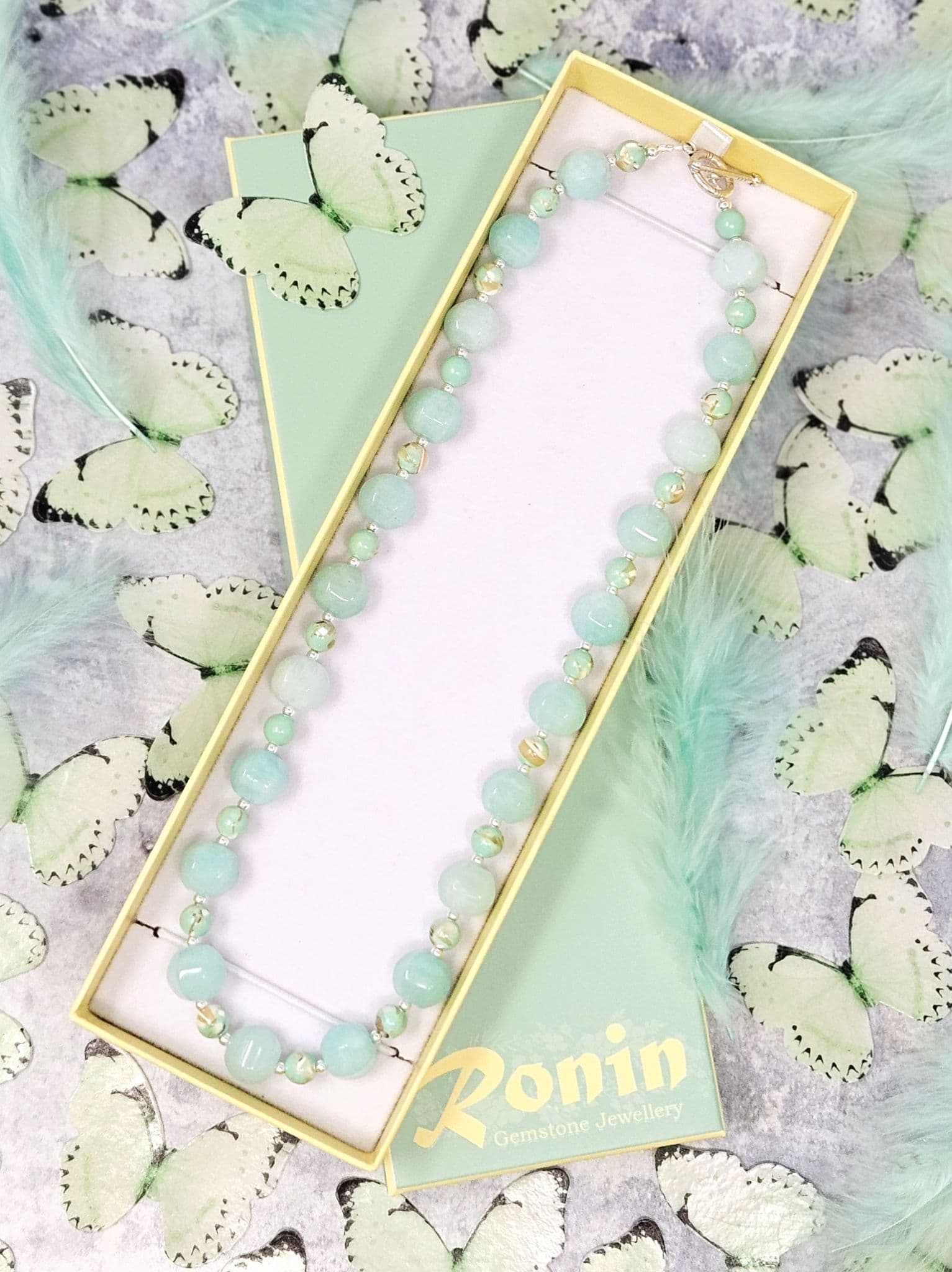 A beautiful colourway, so summery - semi-precious gemstones alongside shell beads that have shimmery Mother of Pearl inclusions.