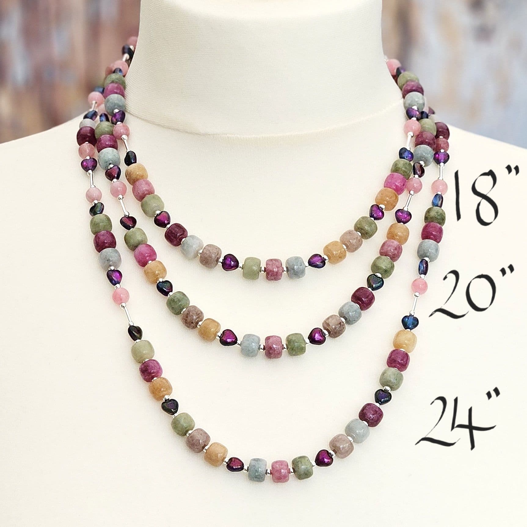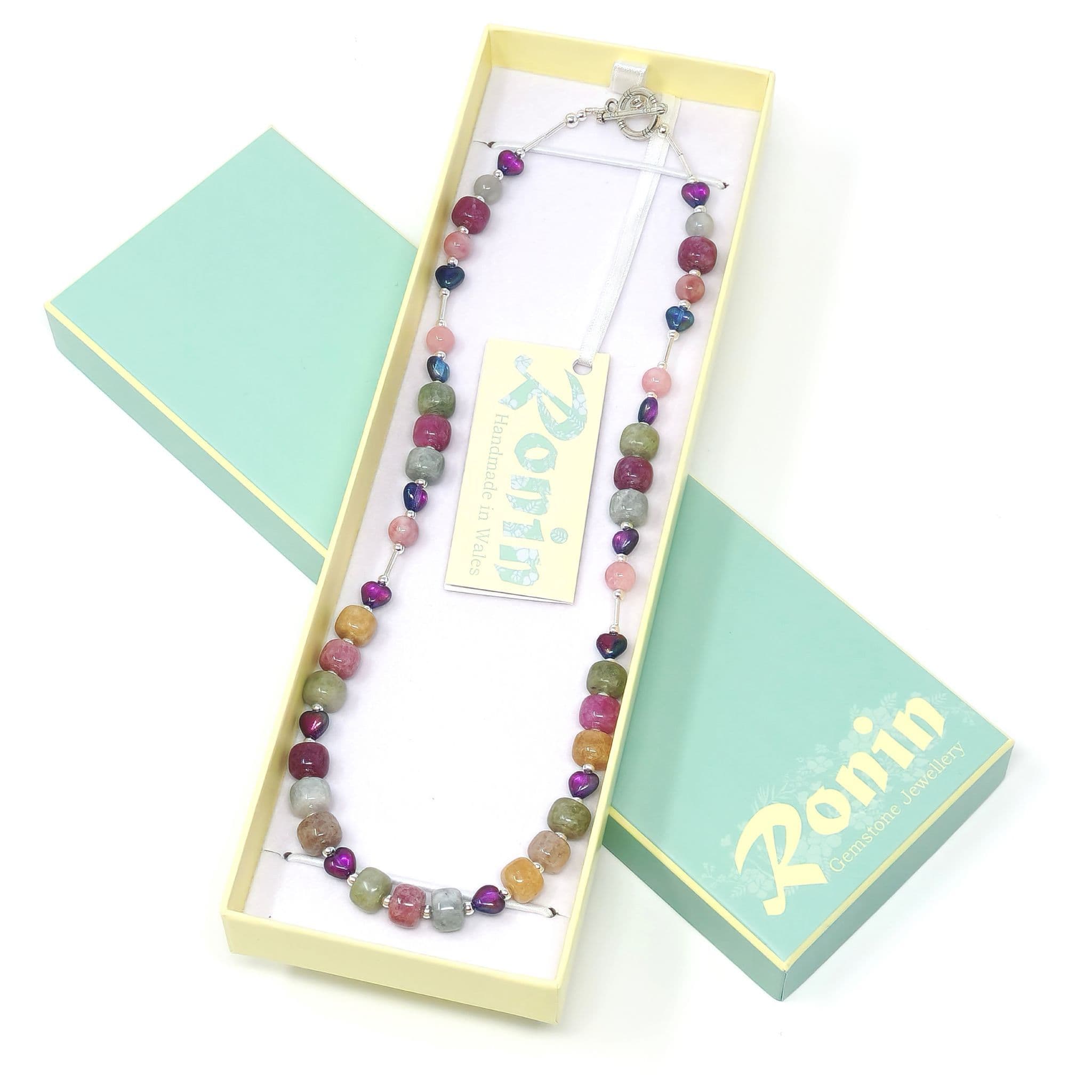Semi-precious gemstones in an array of chalky shades, with highlights of small, vivid glass hearts.