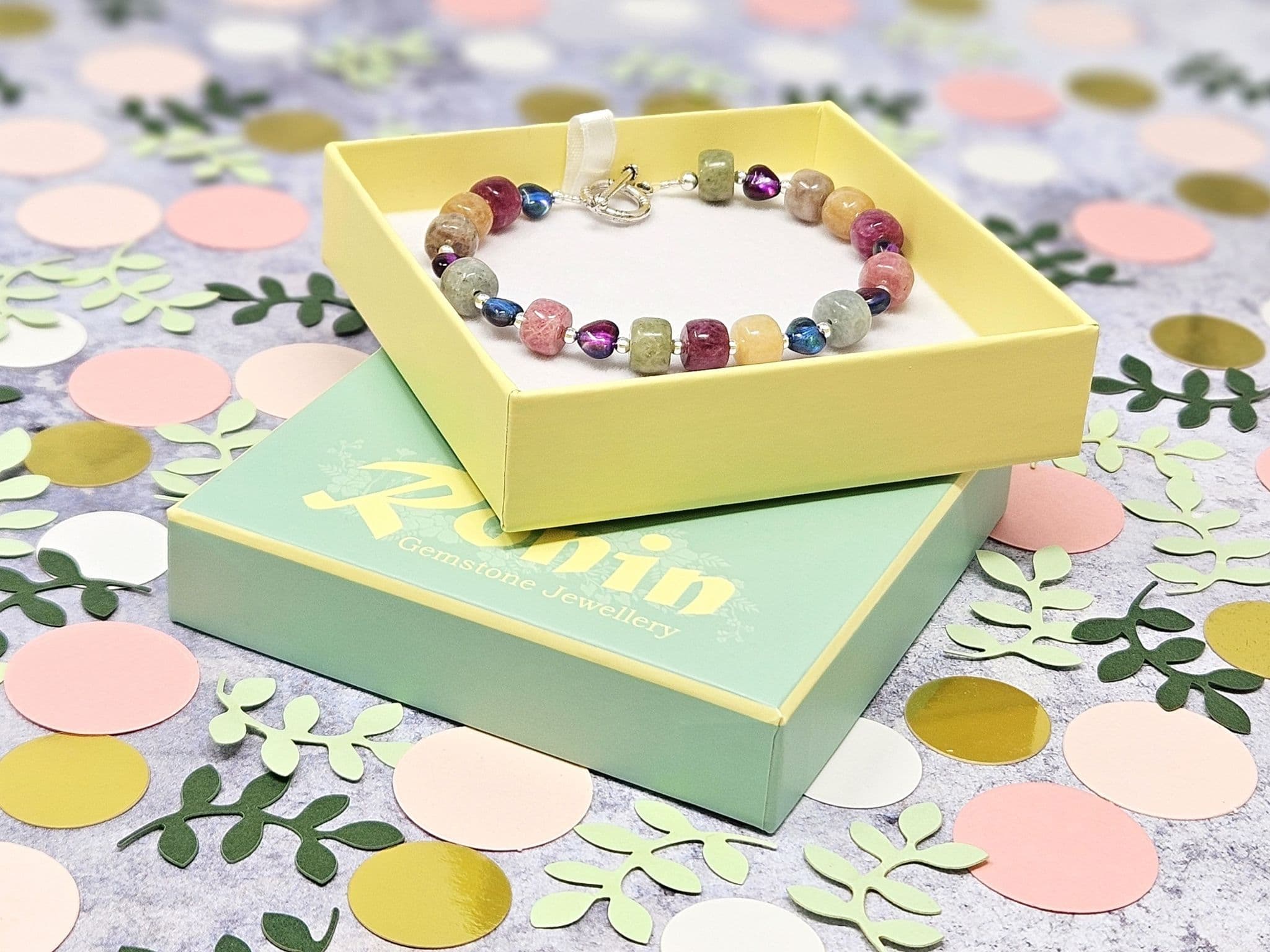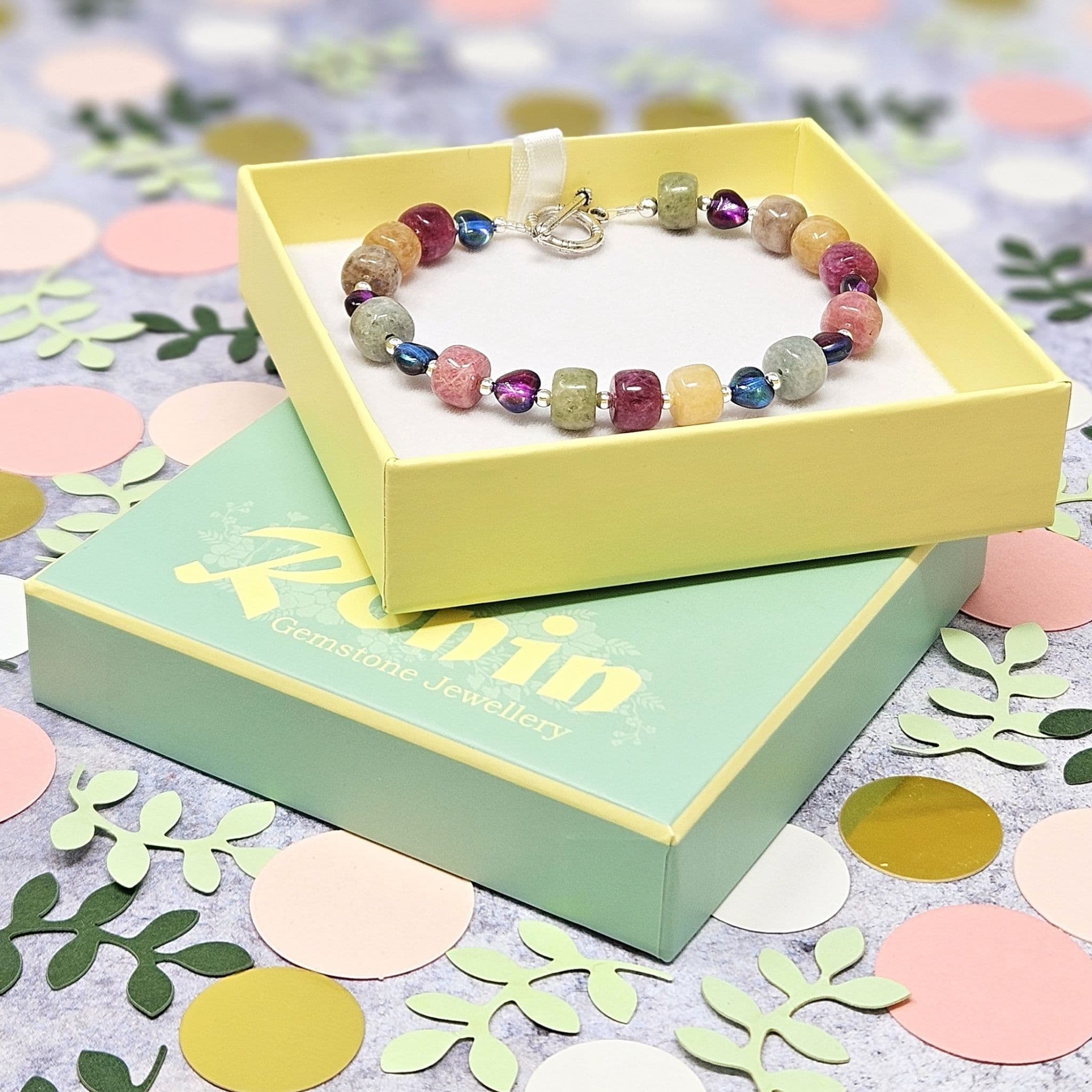 Semi-precious gemstones in chalky shades alongside small glass heart beads.