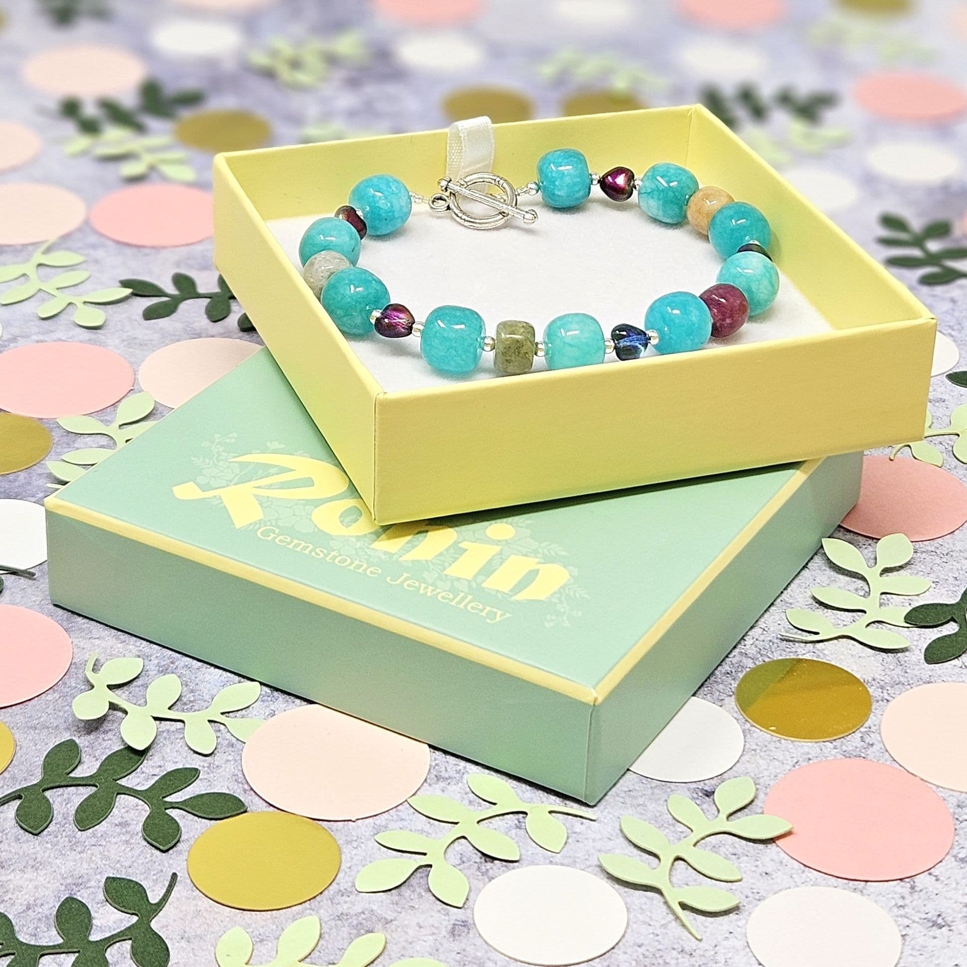 Vivid blue gemstone beads alongside ones in chalky shades. Glass hearts beads add a highlight.