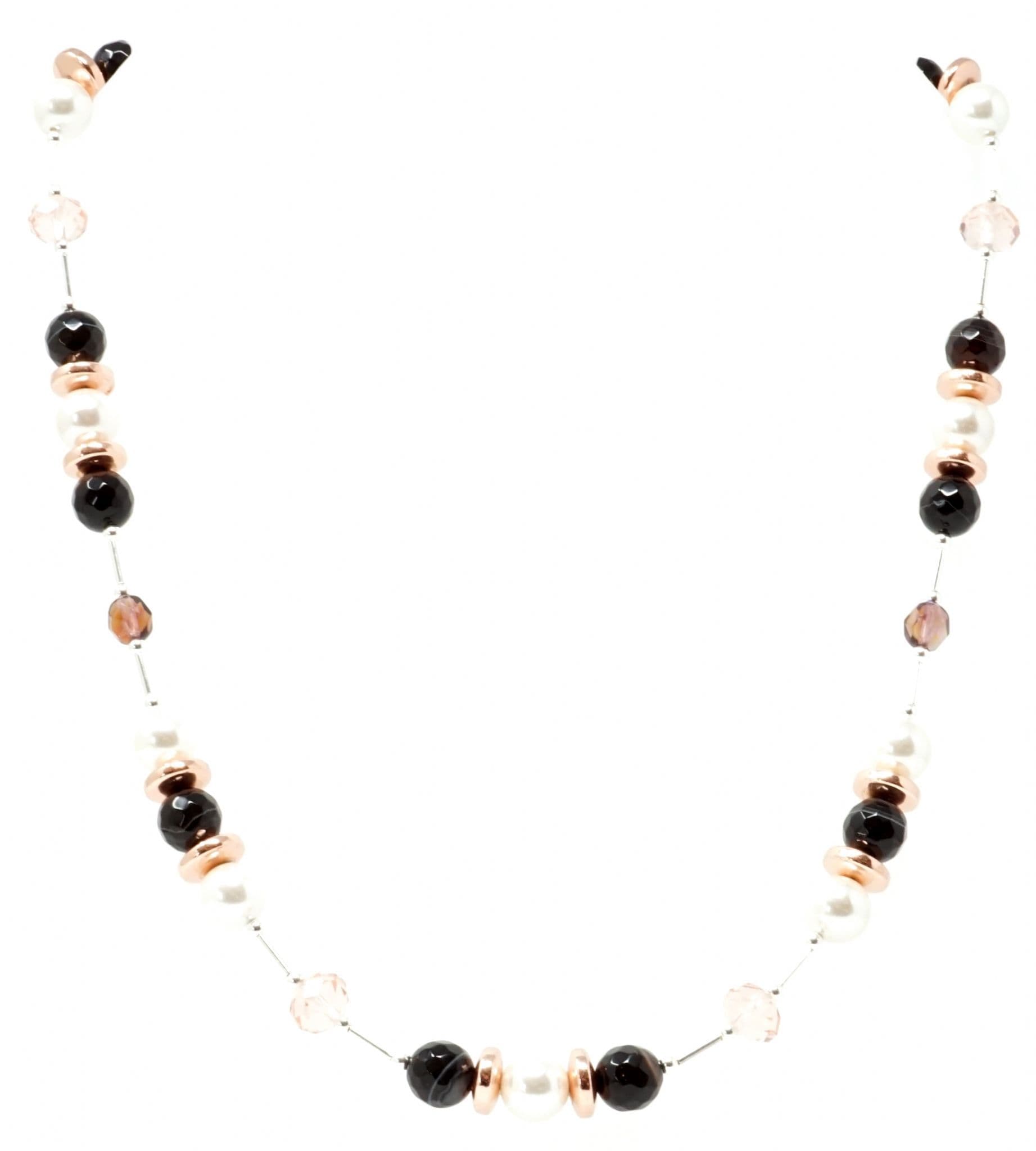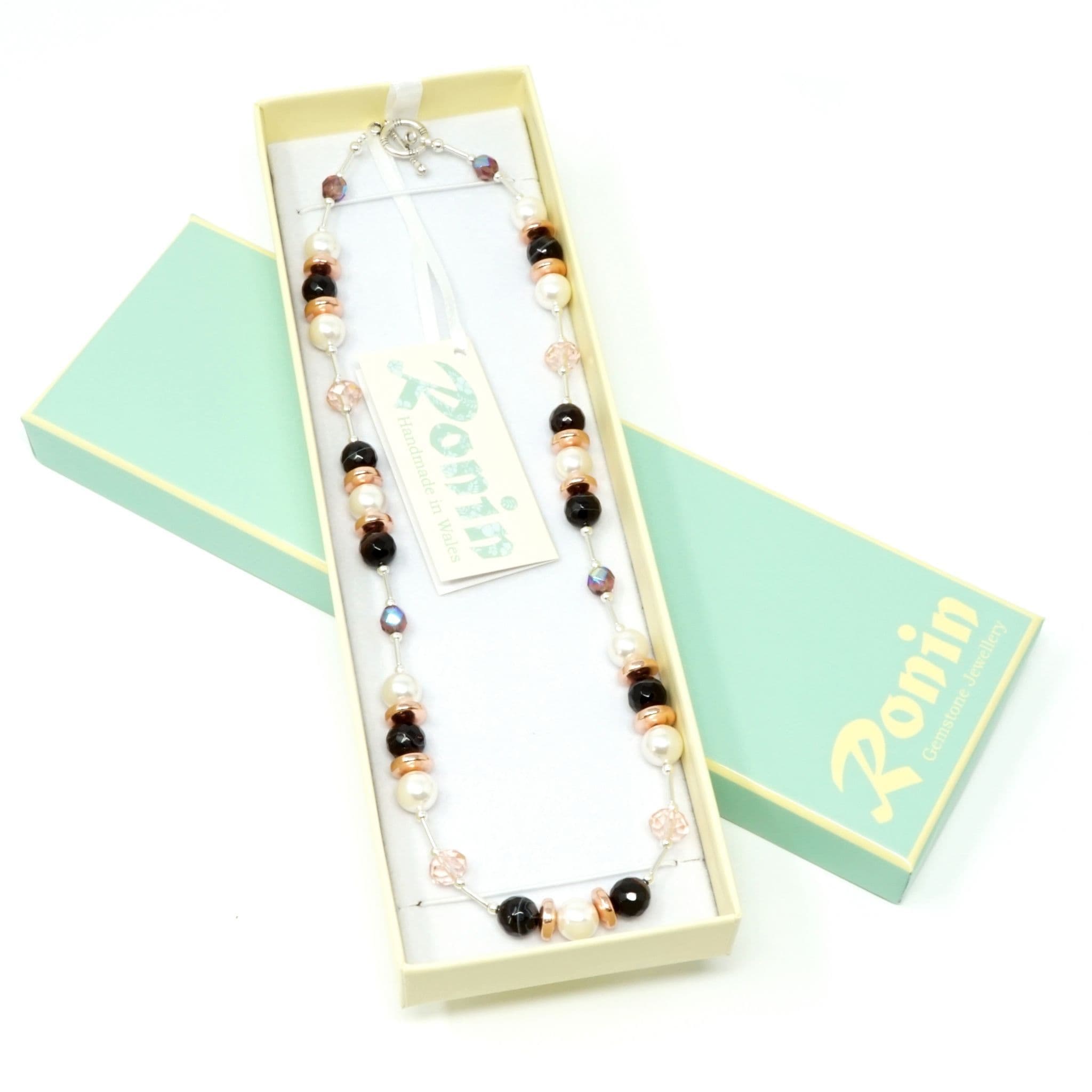 Natural Agate gemstones alongside rose gold coloured Haematite discs, crystal beads & South Sea Shell Pearl beads. South Sea Shell Pearls are factory made rather than grown in an oyster or mussel, using actual shell that is crushed to make the coating.