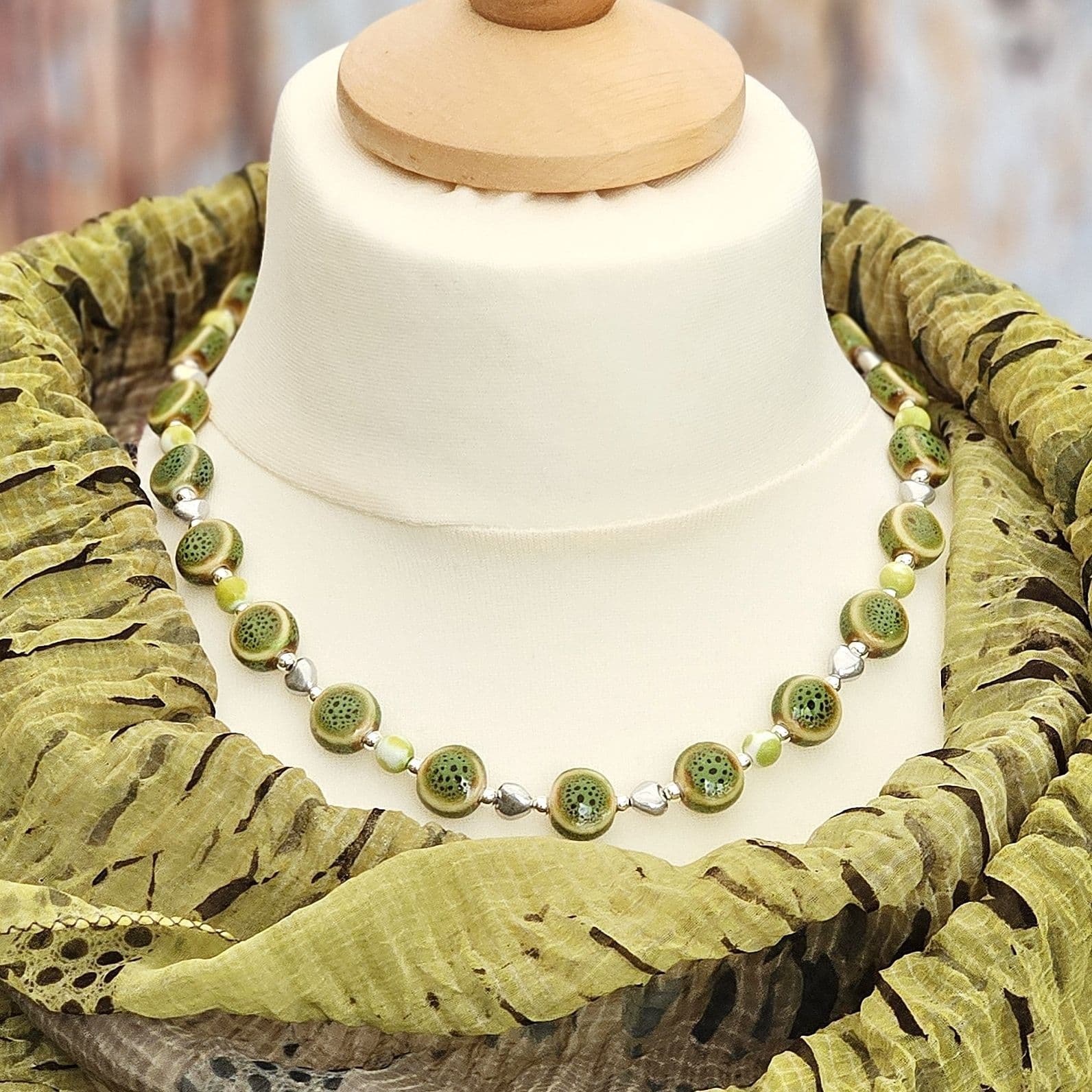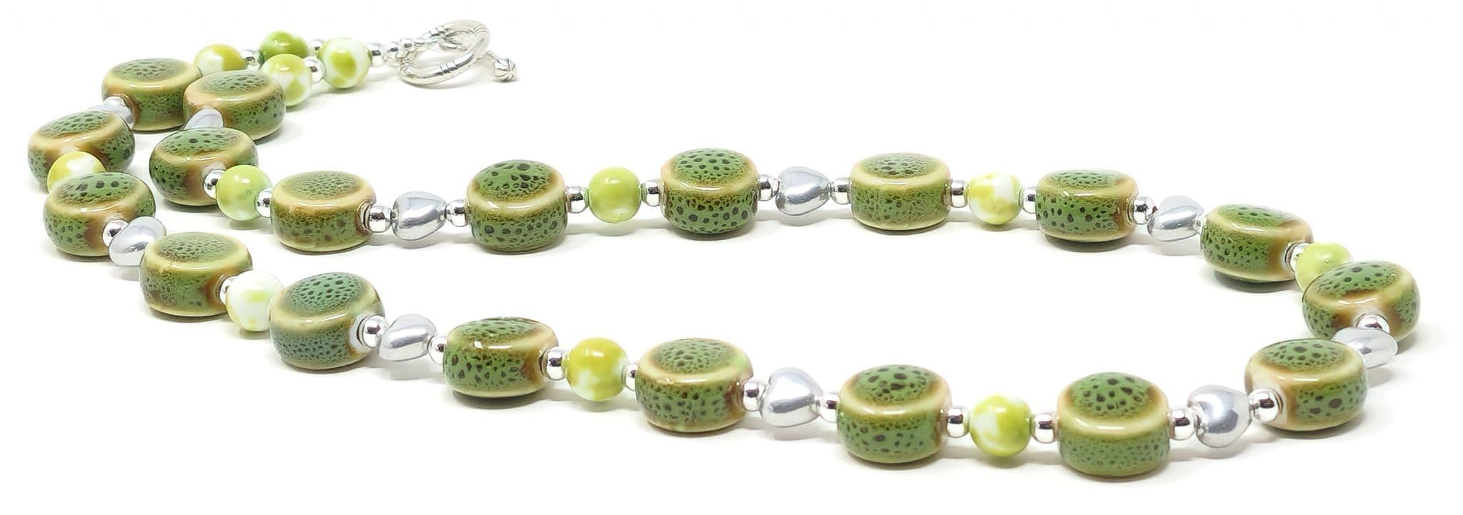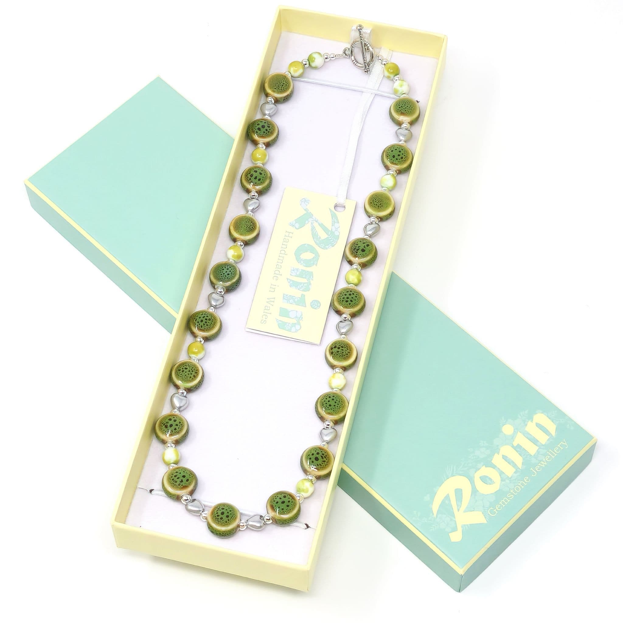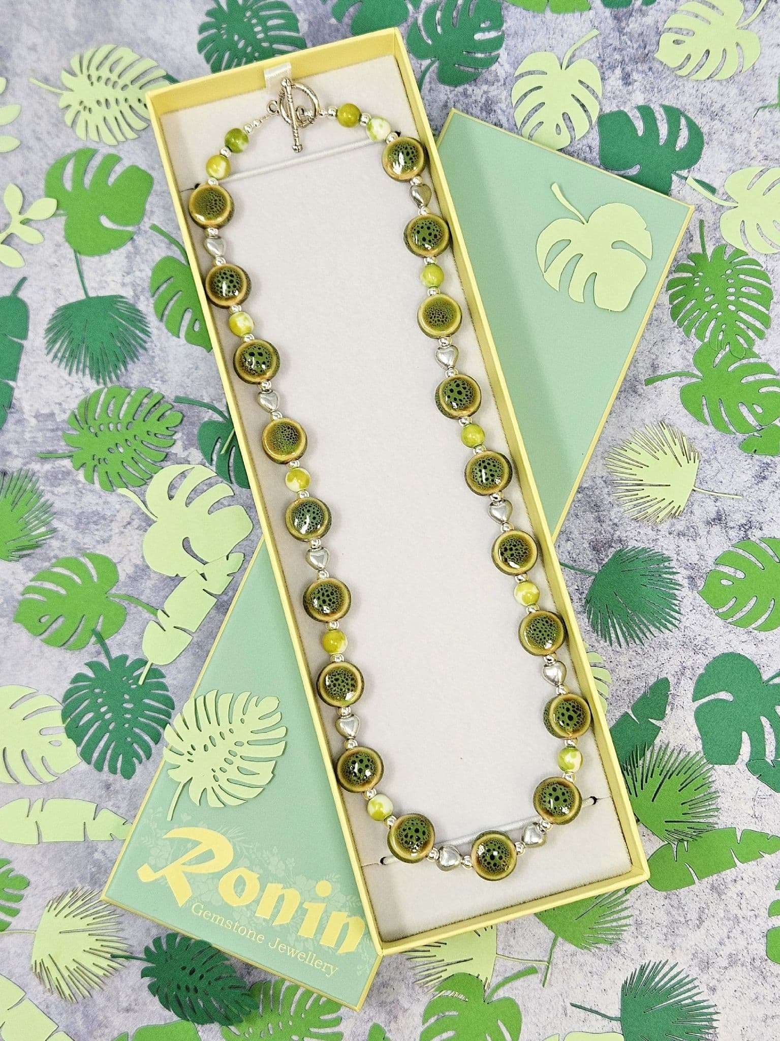 Porcelain discs with a beautiful glaze alongside small round semi-precious gemstones, with highlights of small glass hearts.