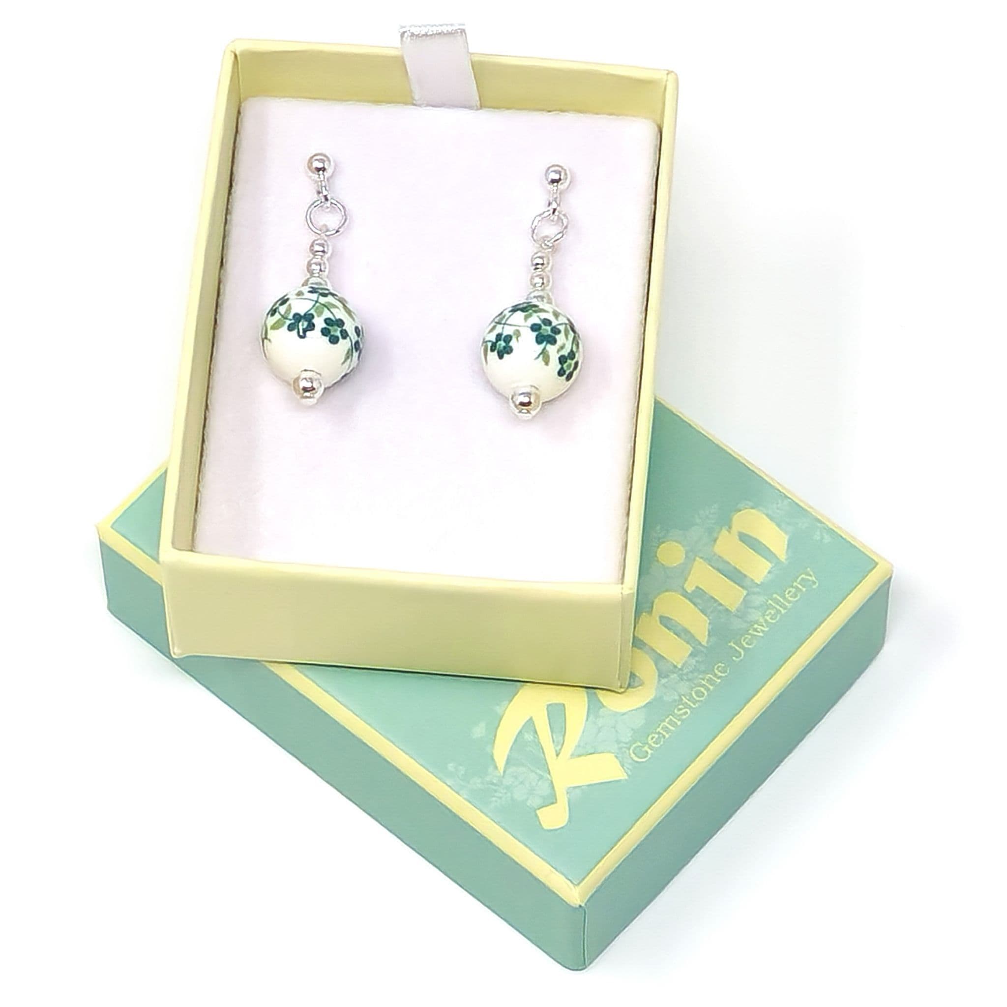 Round porcelain beads with floral patterning.