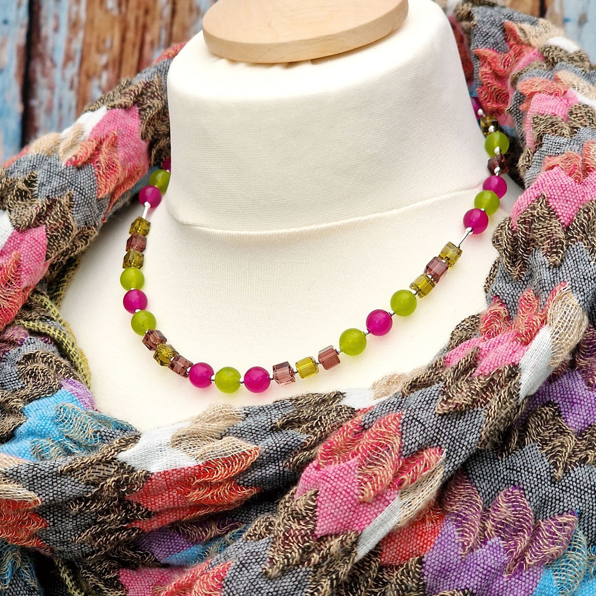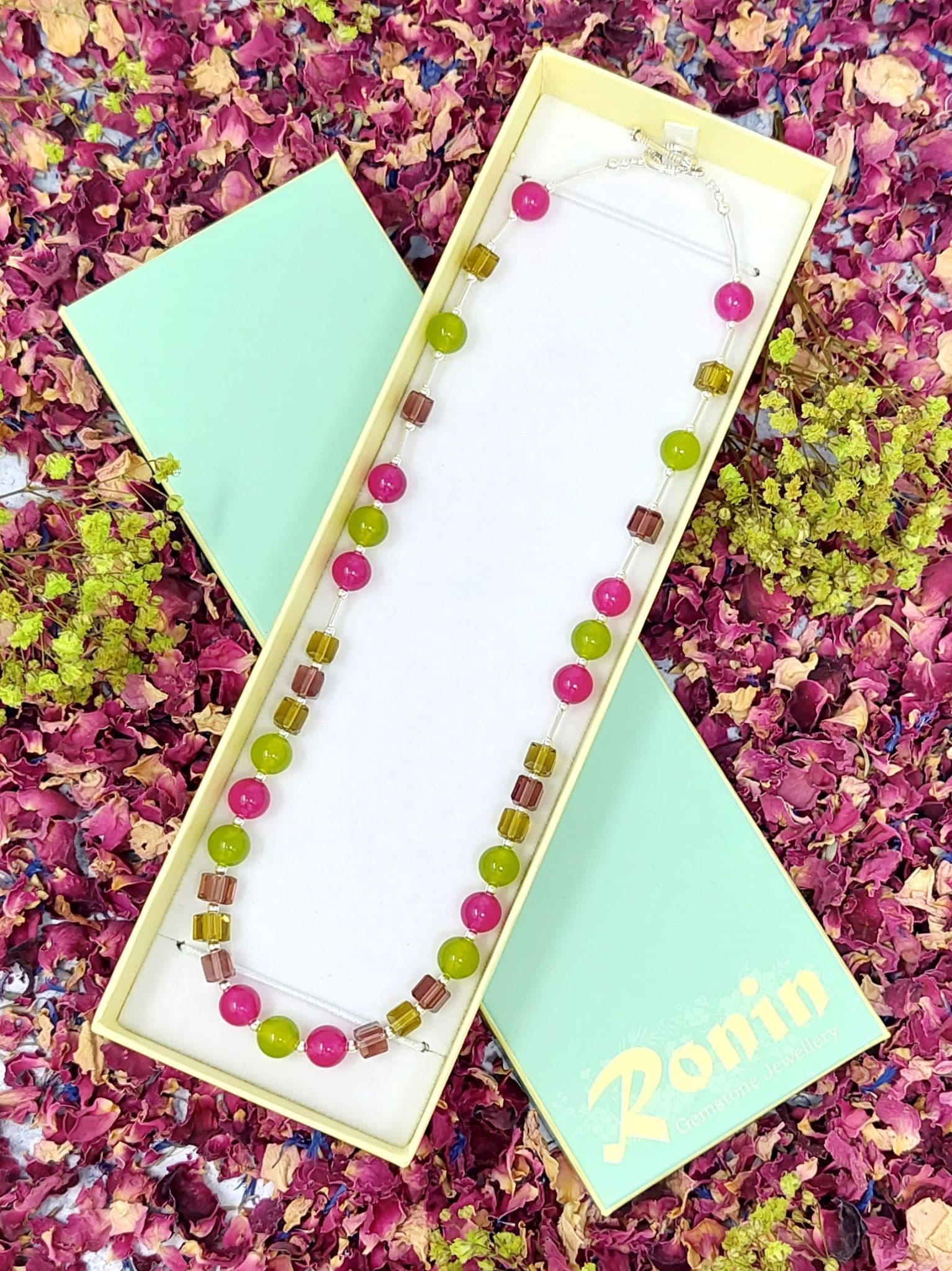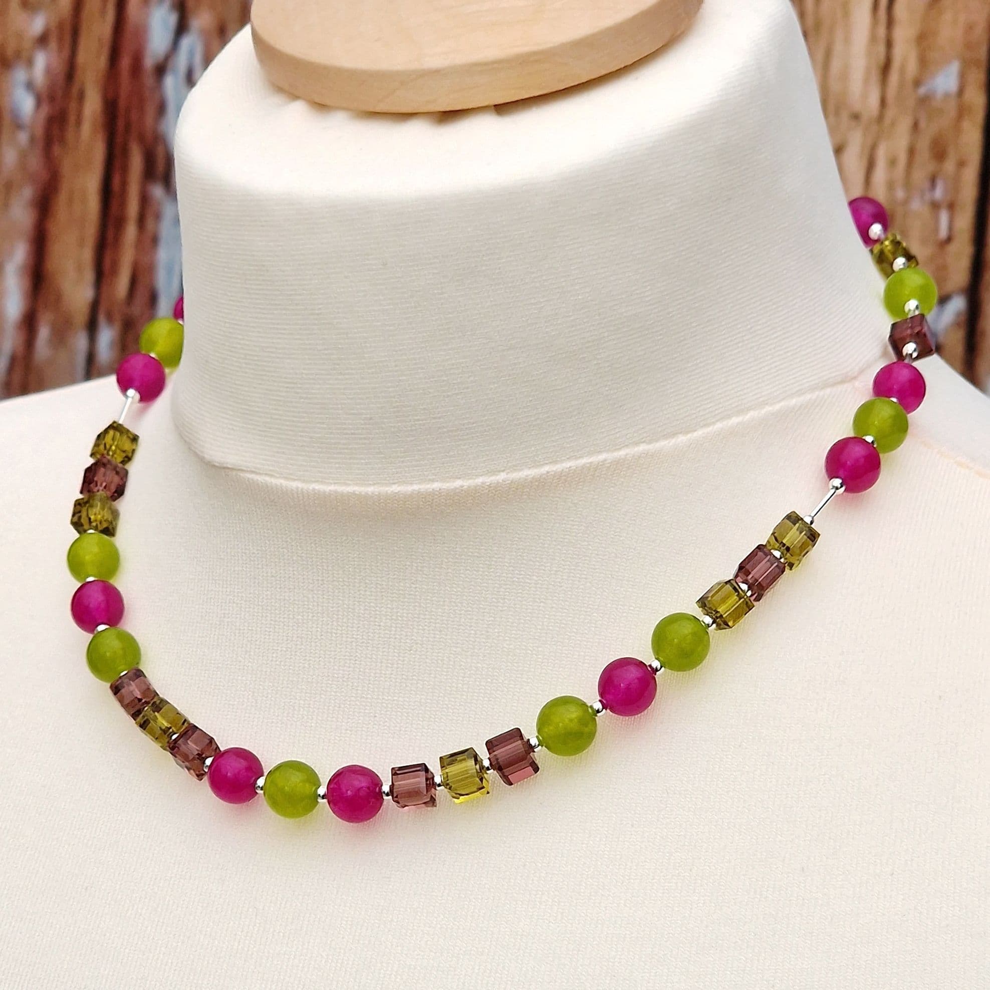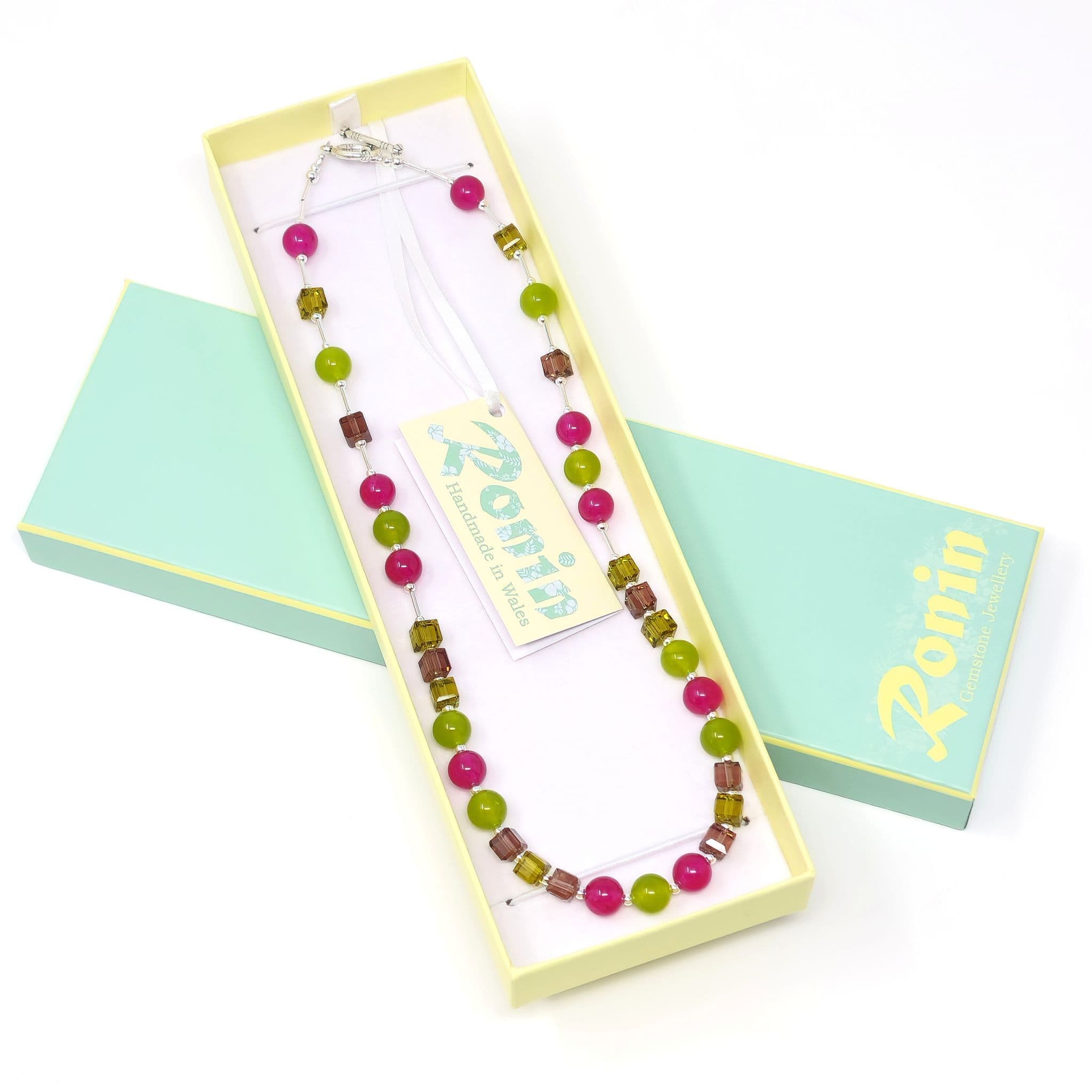 Round dyed Chalcedony gemstone beads in 2 colours are combined with cube shaped Crystal beads.
