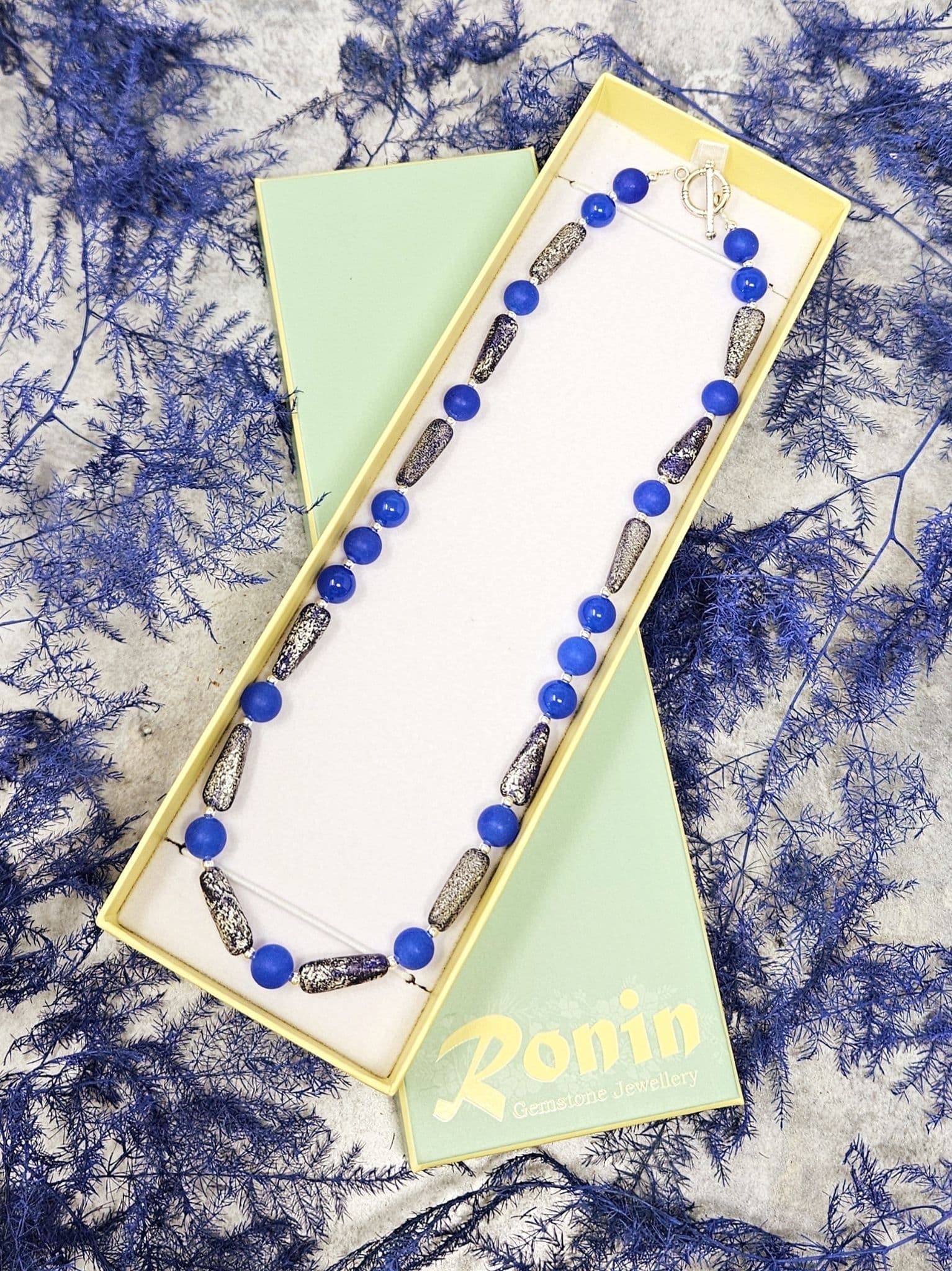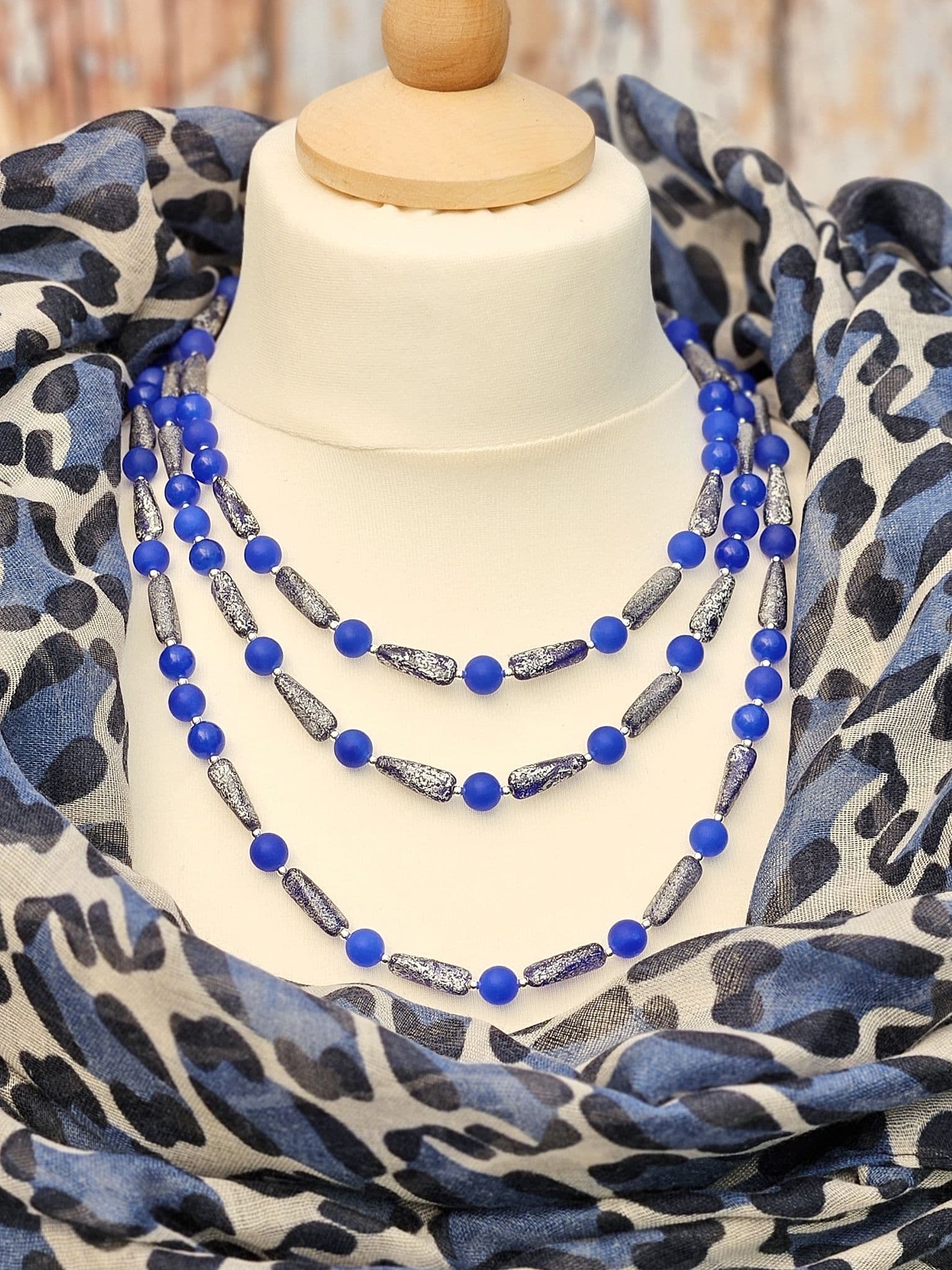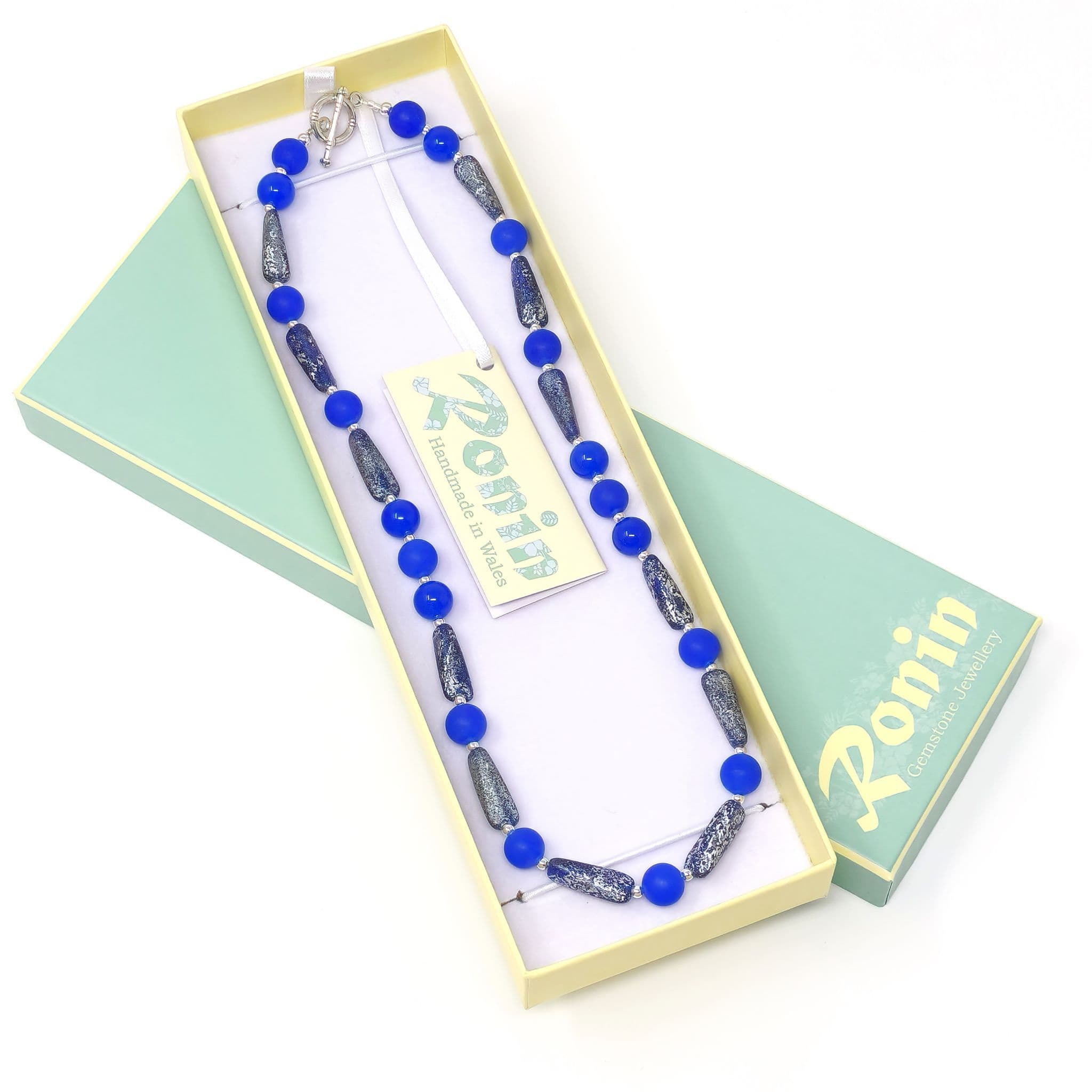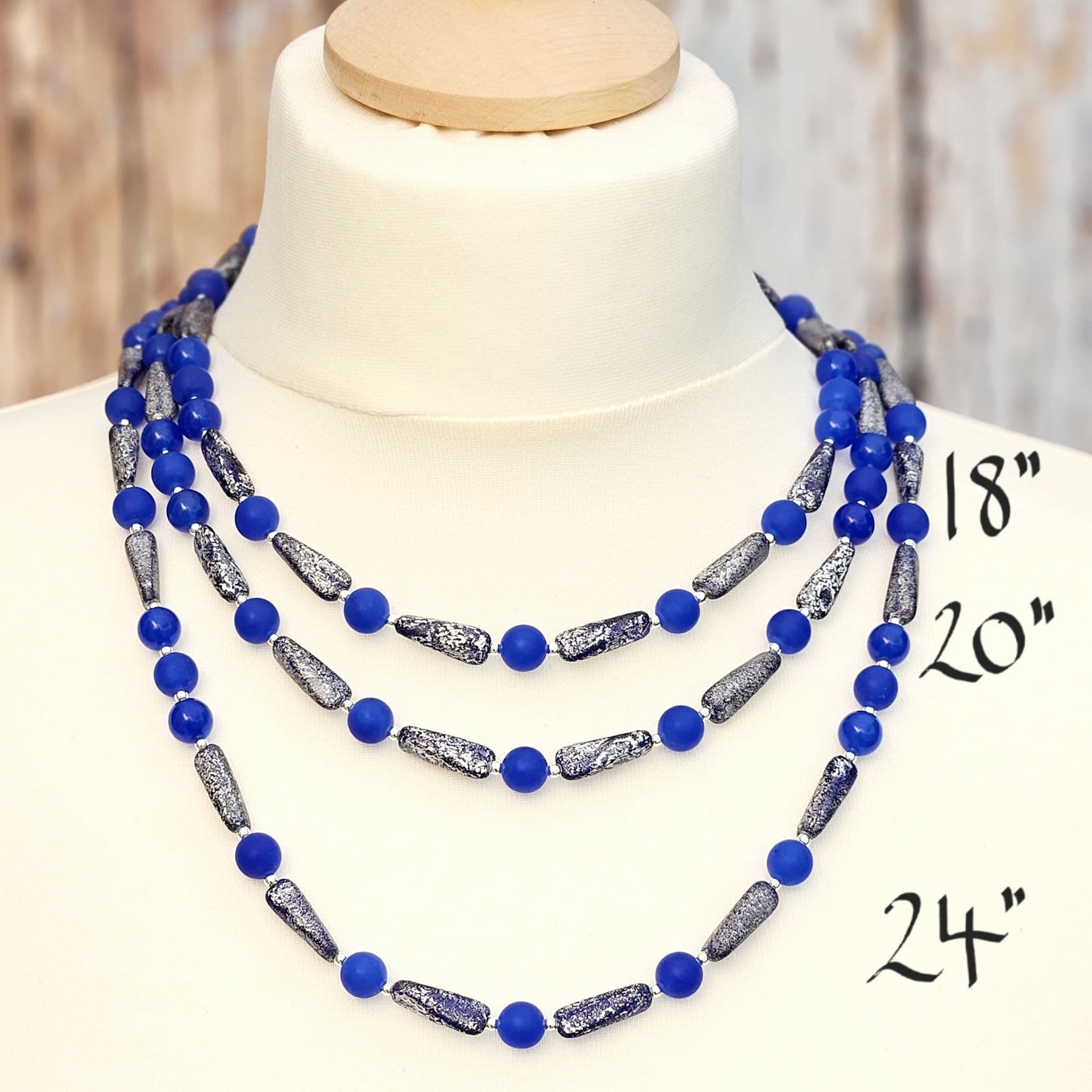 Blue semi-precious gemstones, with a frosted finish, alongside beautiful glass beads