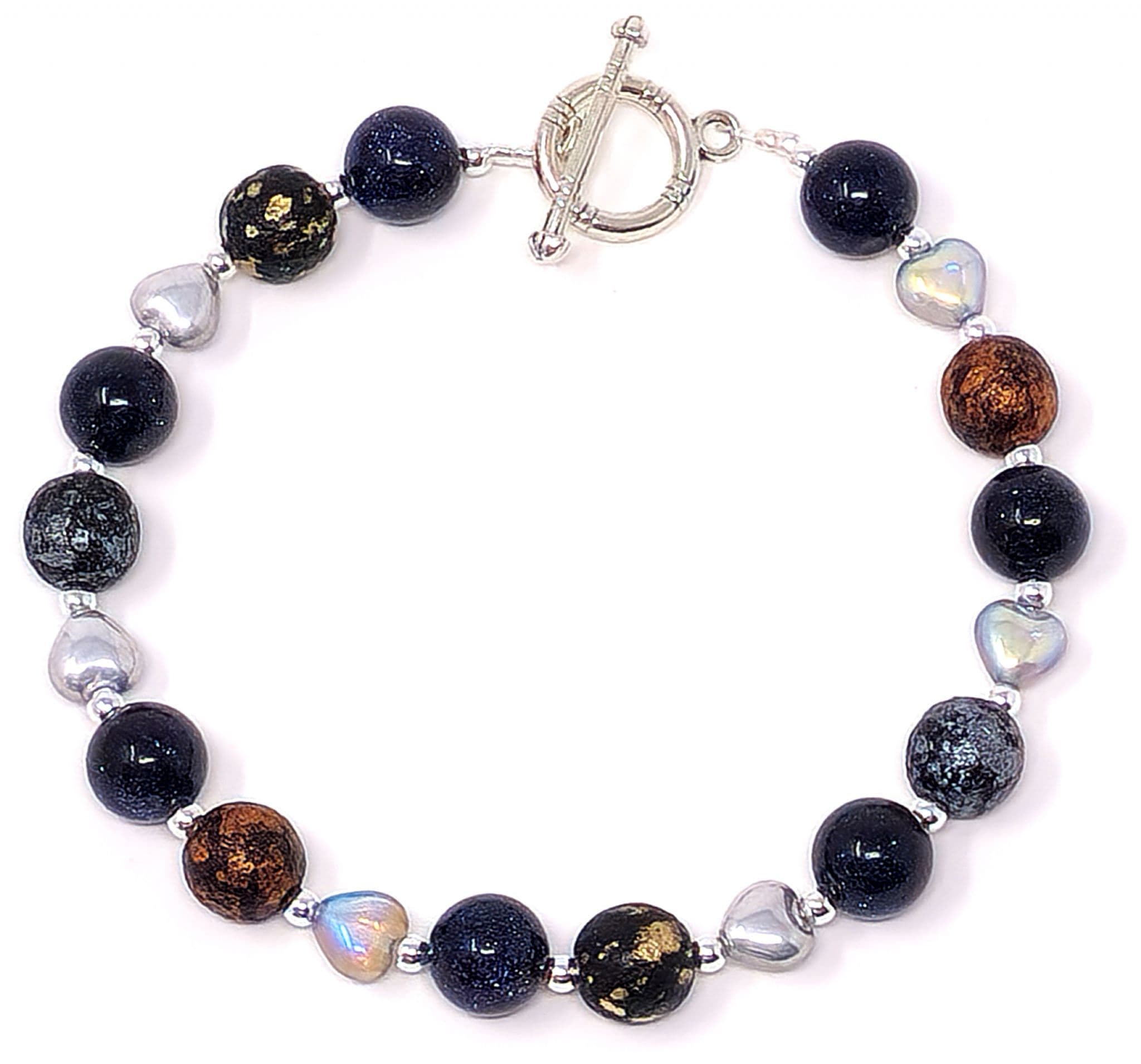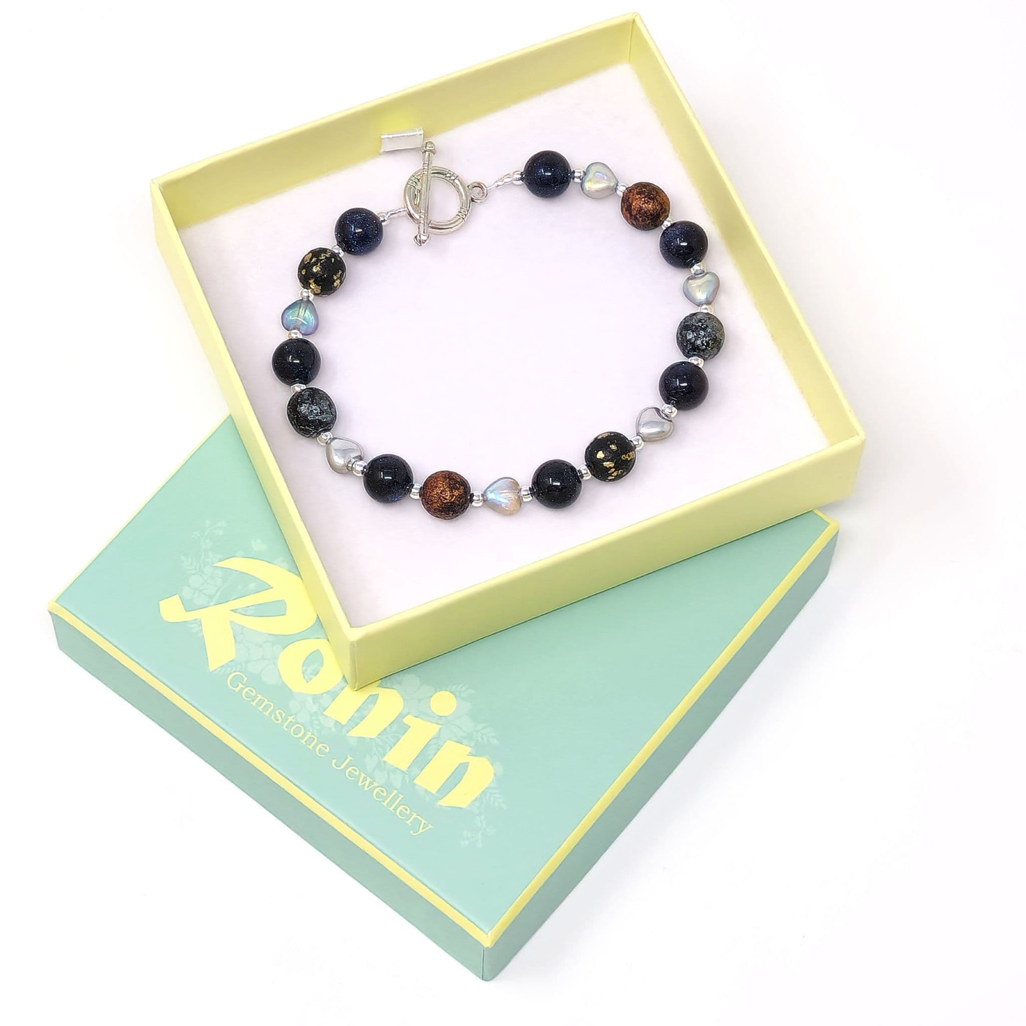 Blue Goldstone beads, which have a subtle glittery sparkle, & glass beads.