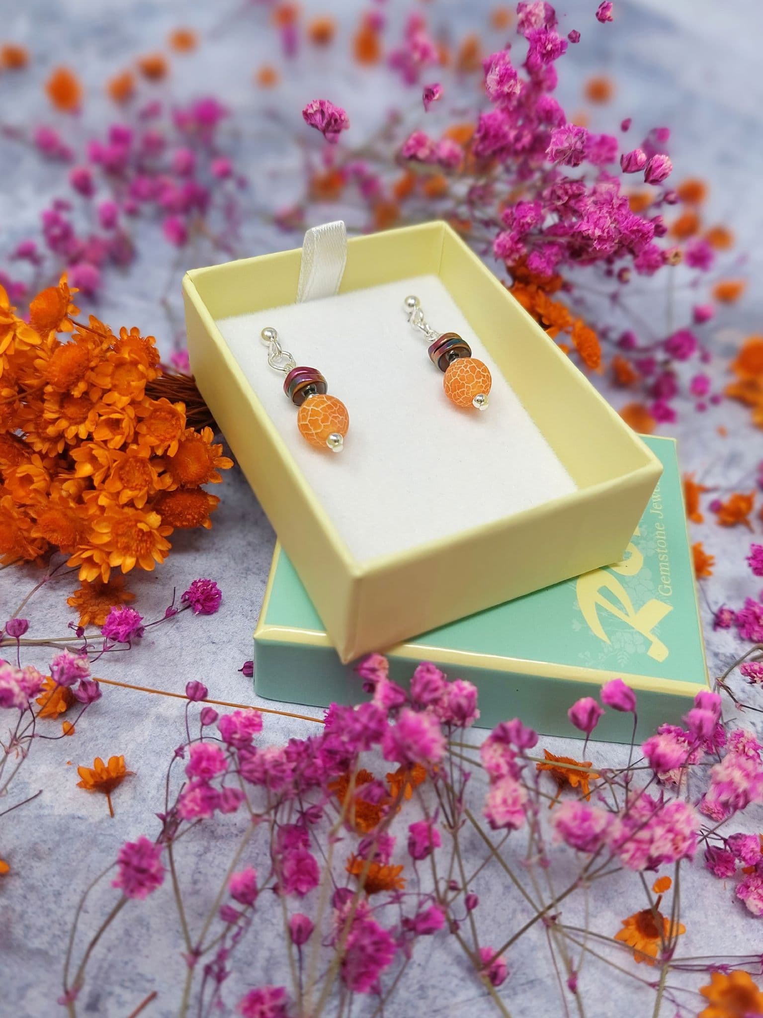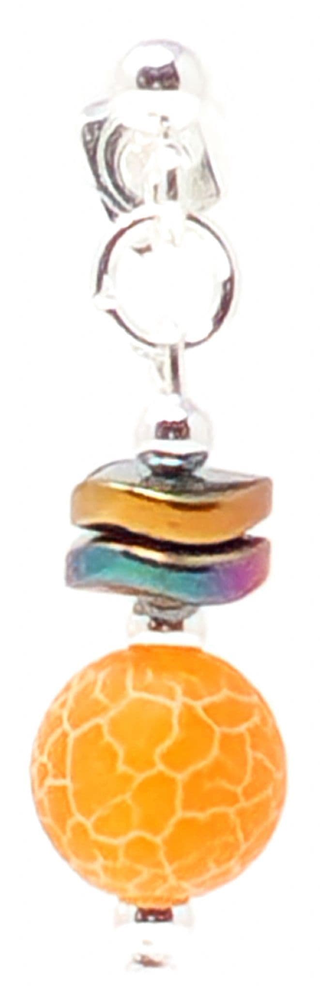 Agate gemstone beads with Haematite beads above. Silver plated spacer beads.
