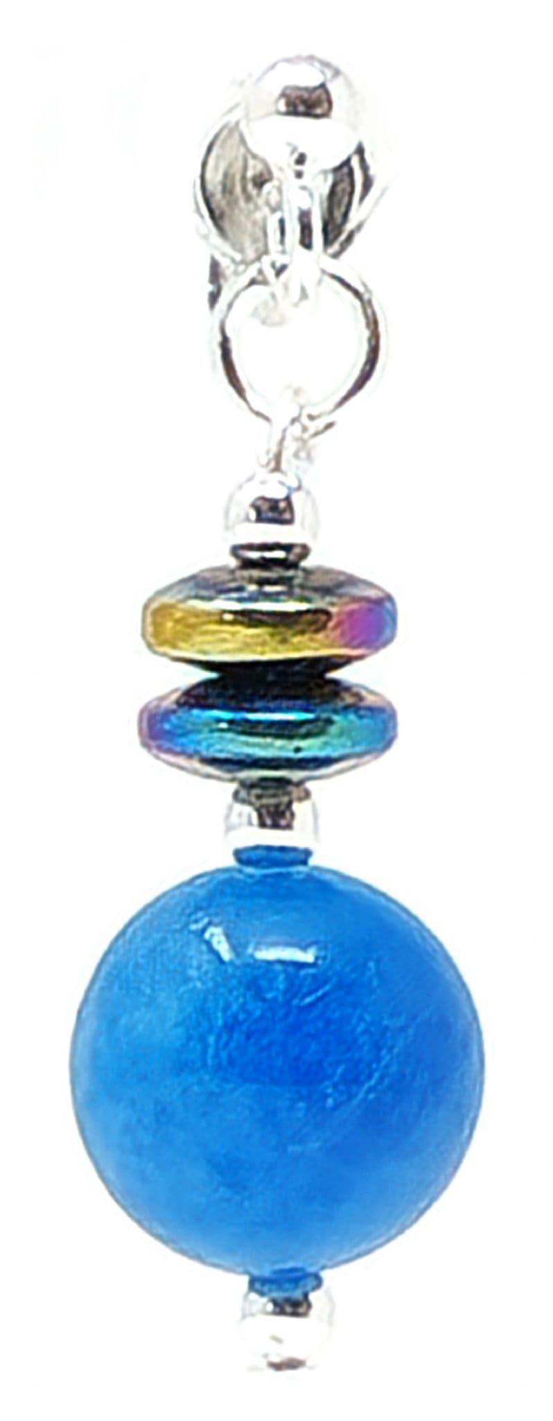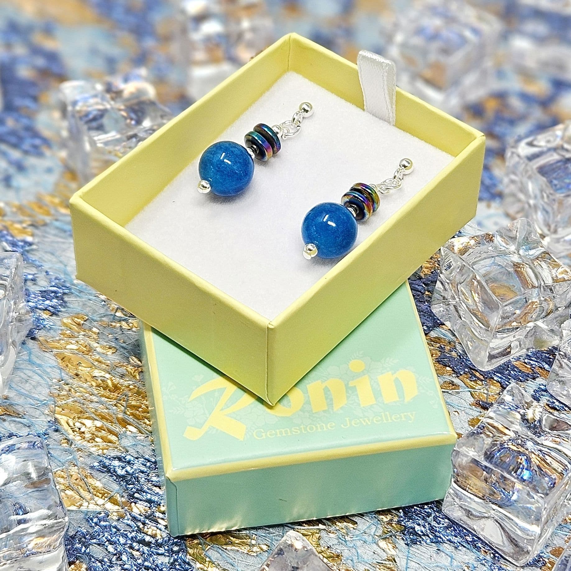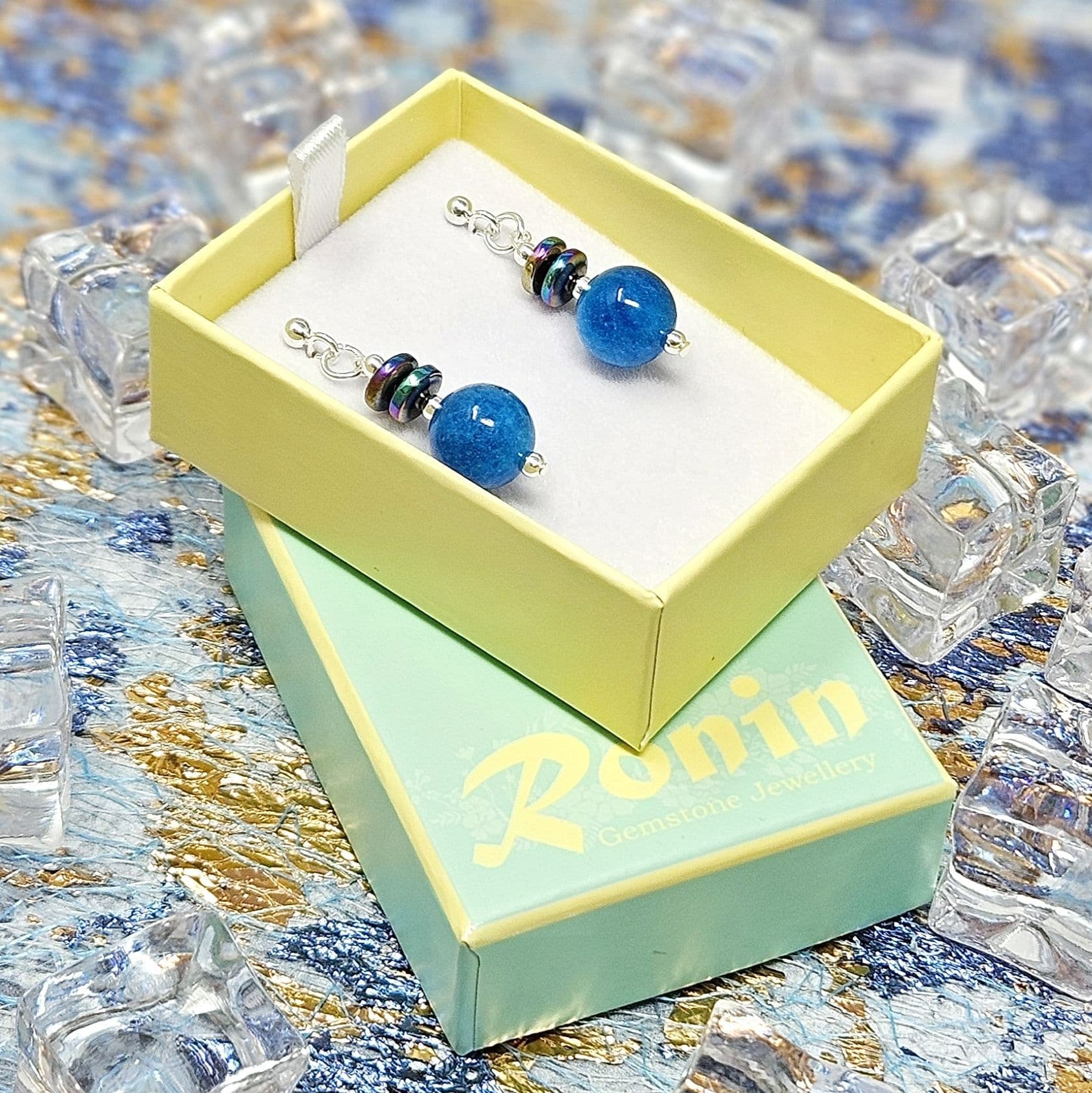 Vivid blue semi-precious gemstones with colourful Haematite discs above..