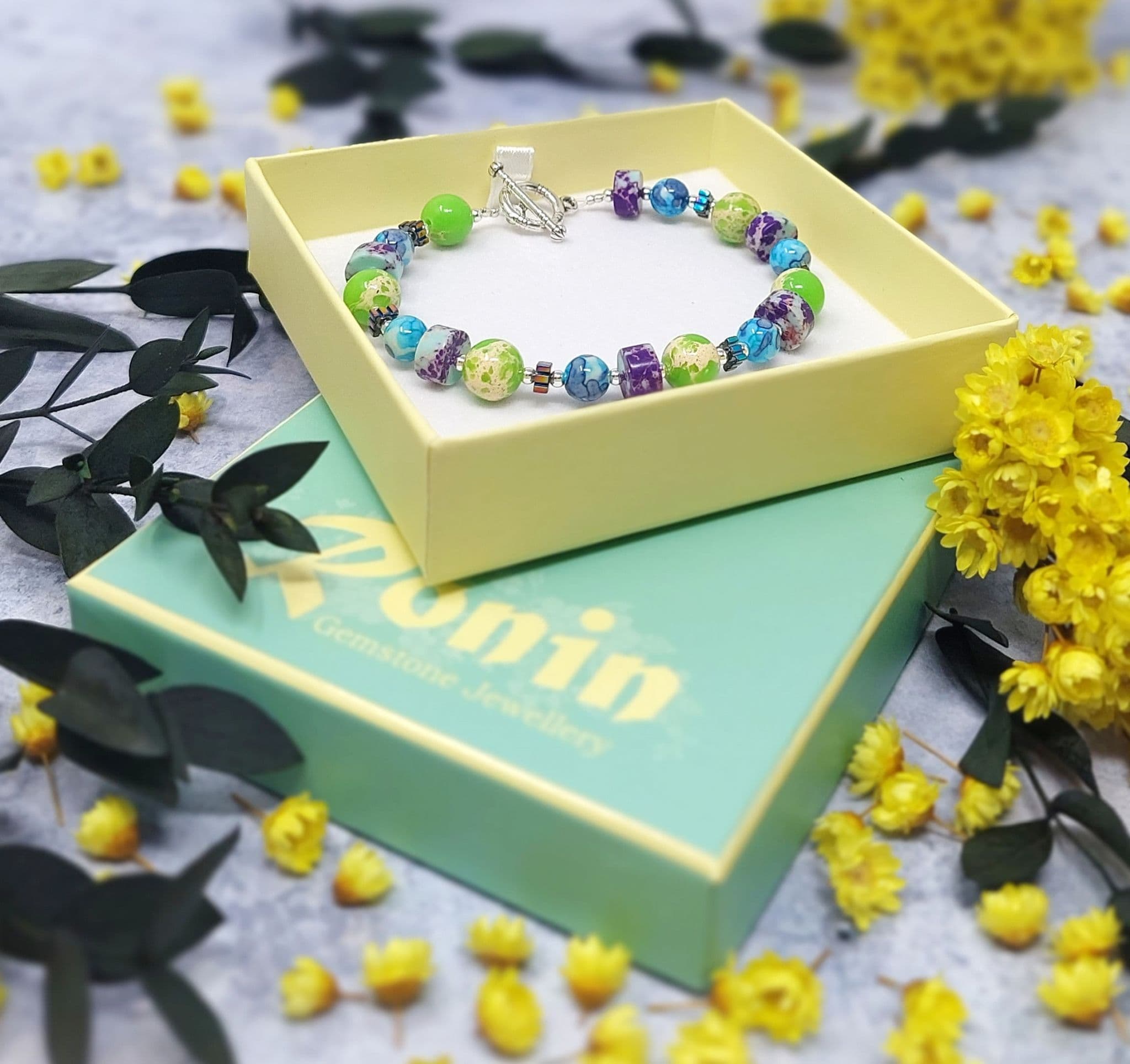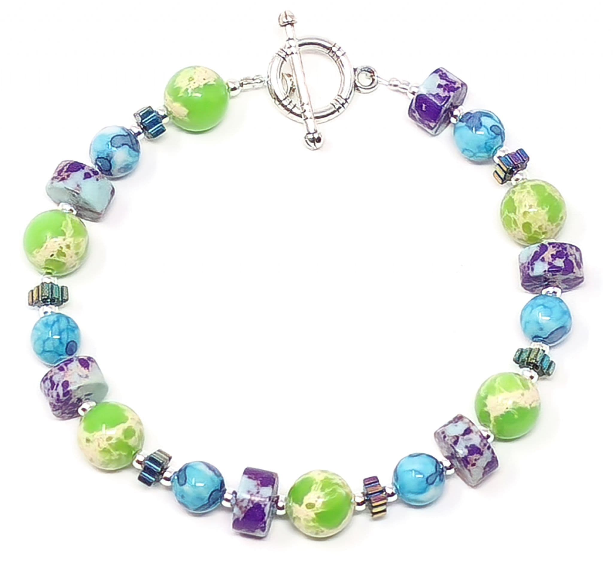 Vivid green patterned gemstone beads are combined with purple and blue patterned gemstones, along with small Haematite beads.