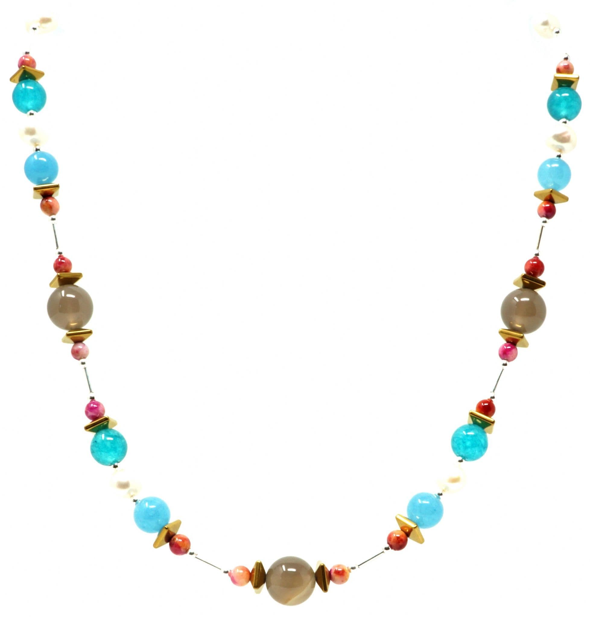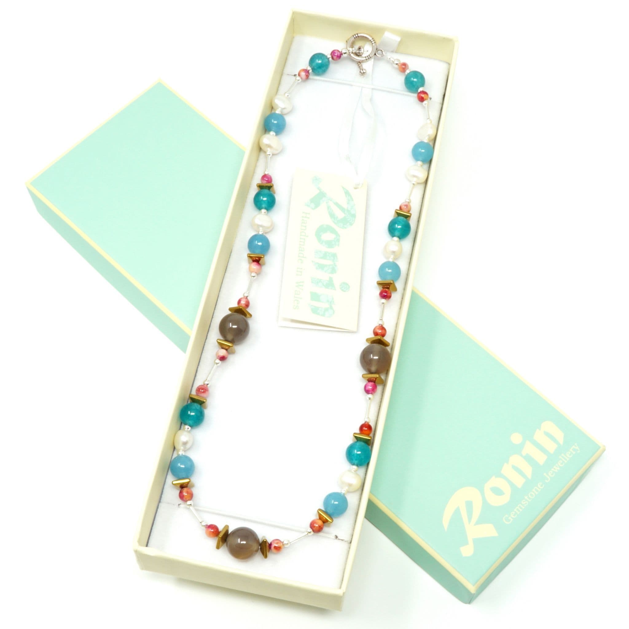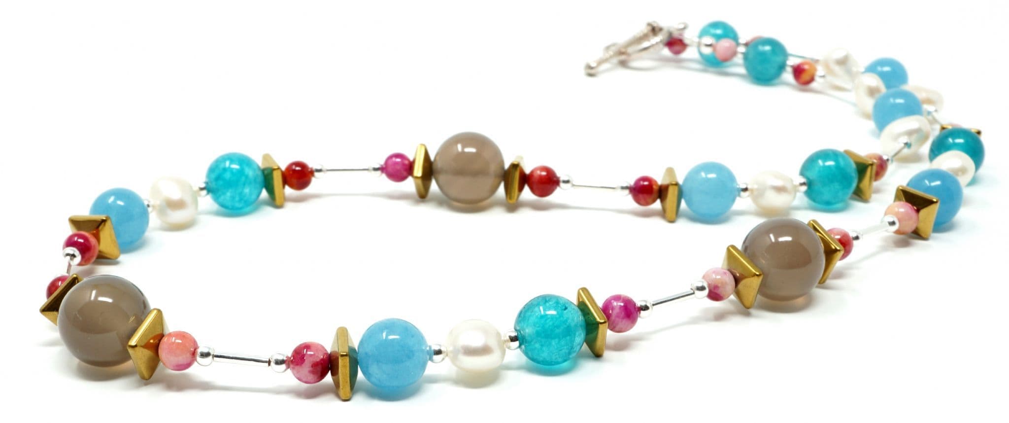 Agate gemstones, Freshwater Pearls, Haematite & dyed Jade.