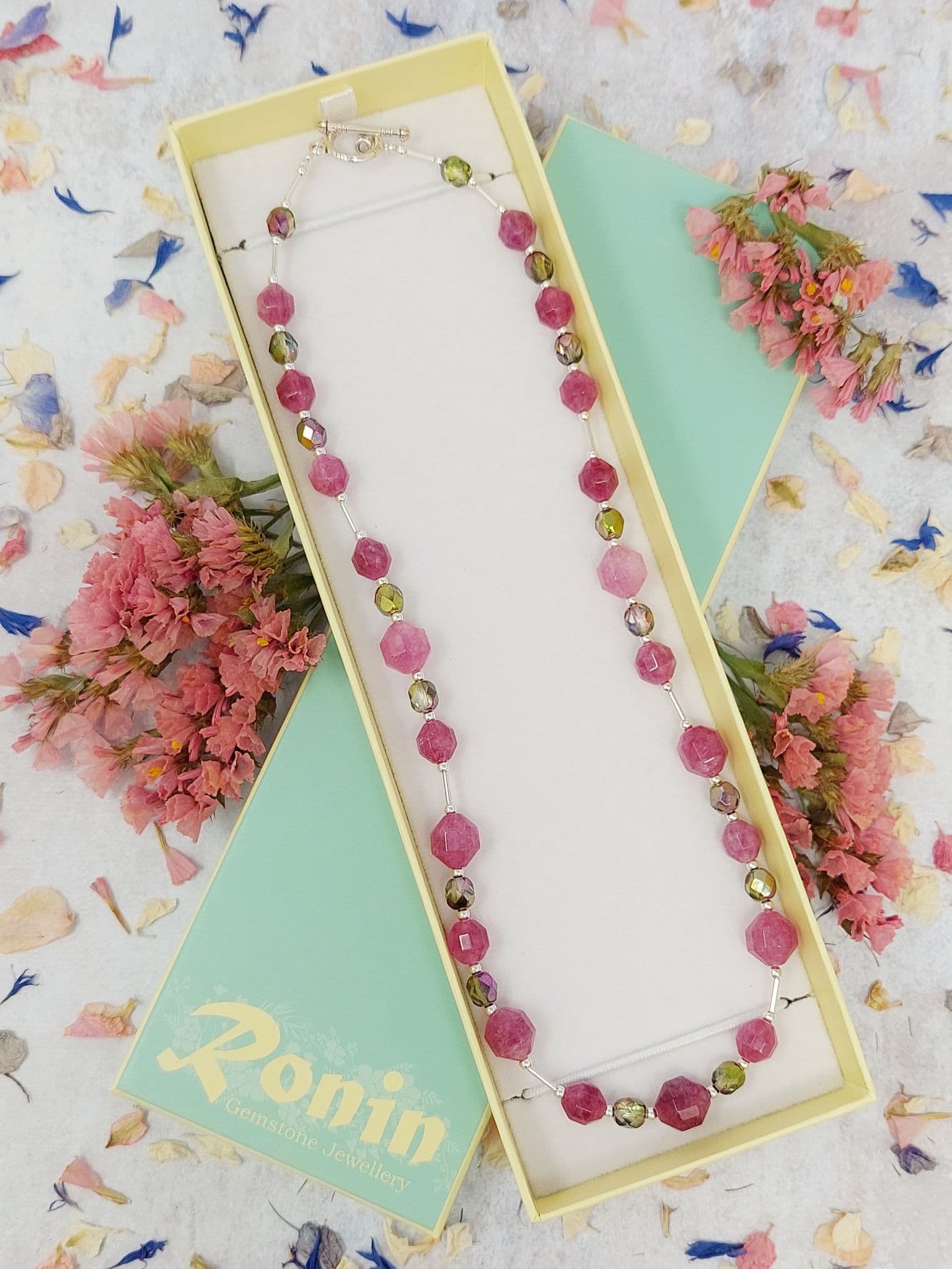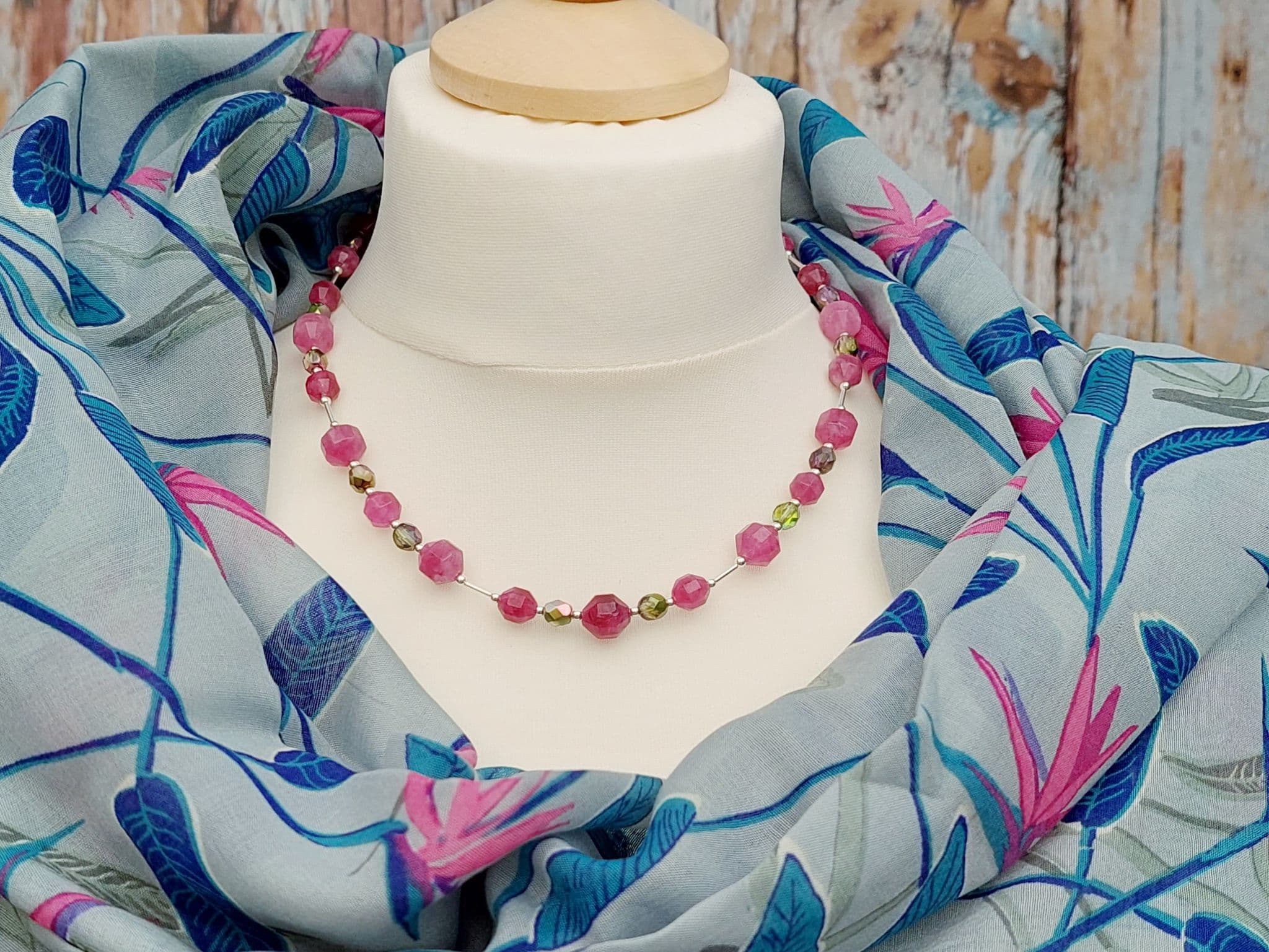 Chalcedony gemstone beads are combined with faceted fire-polished crystal beads.