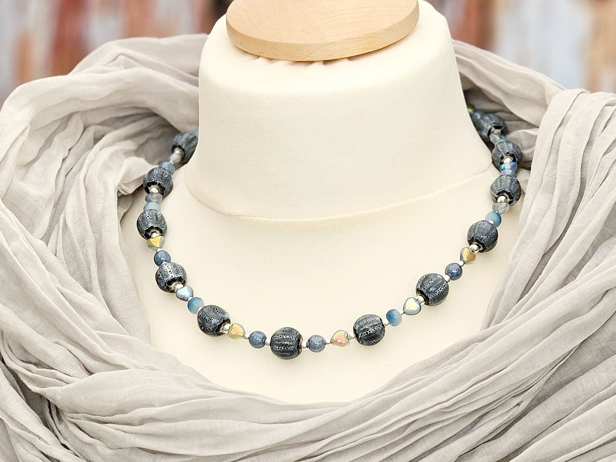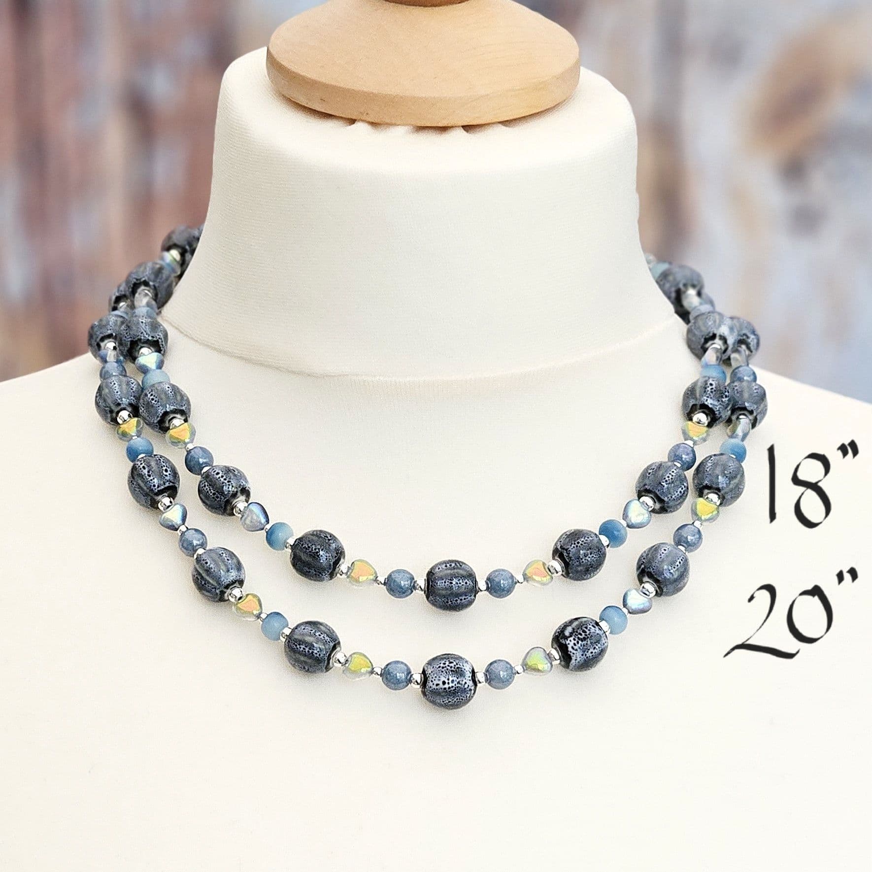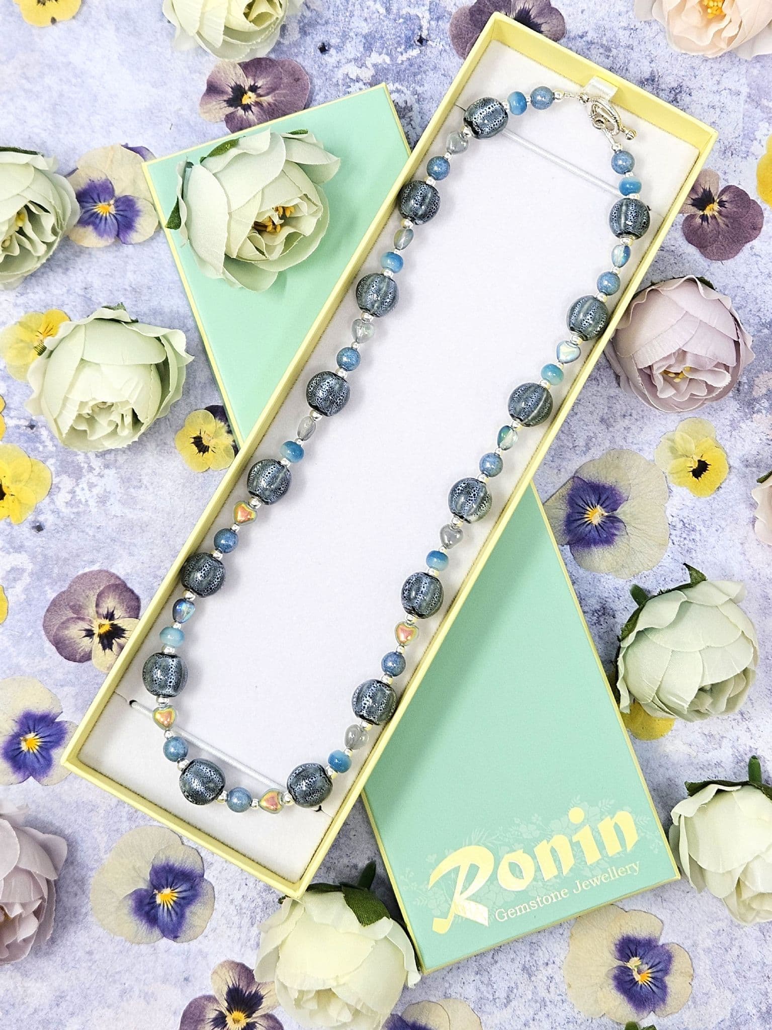 Porcelain beads with a beautiful glaze give this necklace an artisan feel. Small semi-precious gemstones, with highlights of small glass hearts.